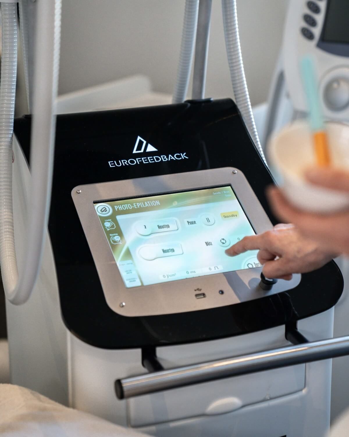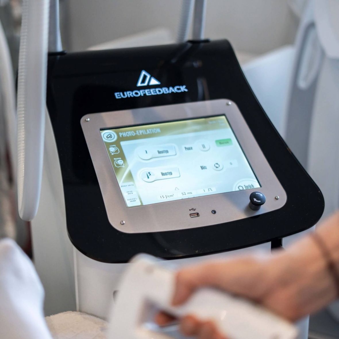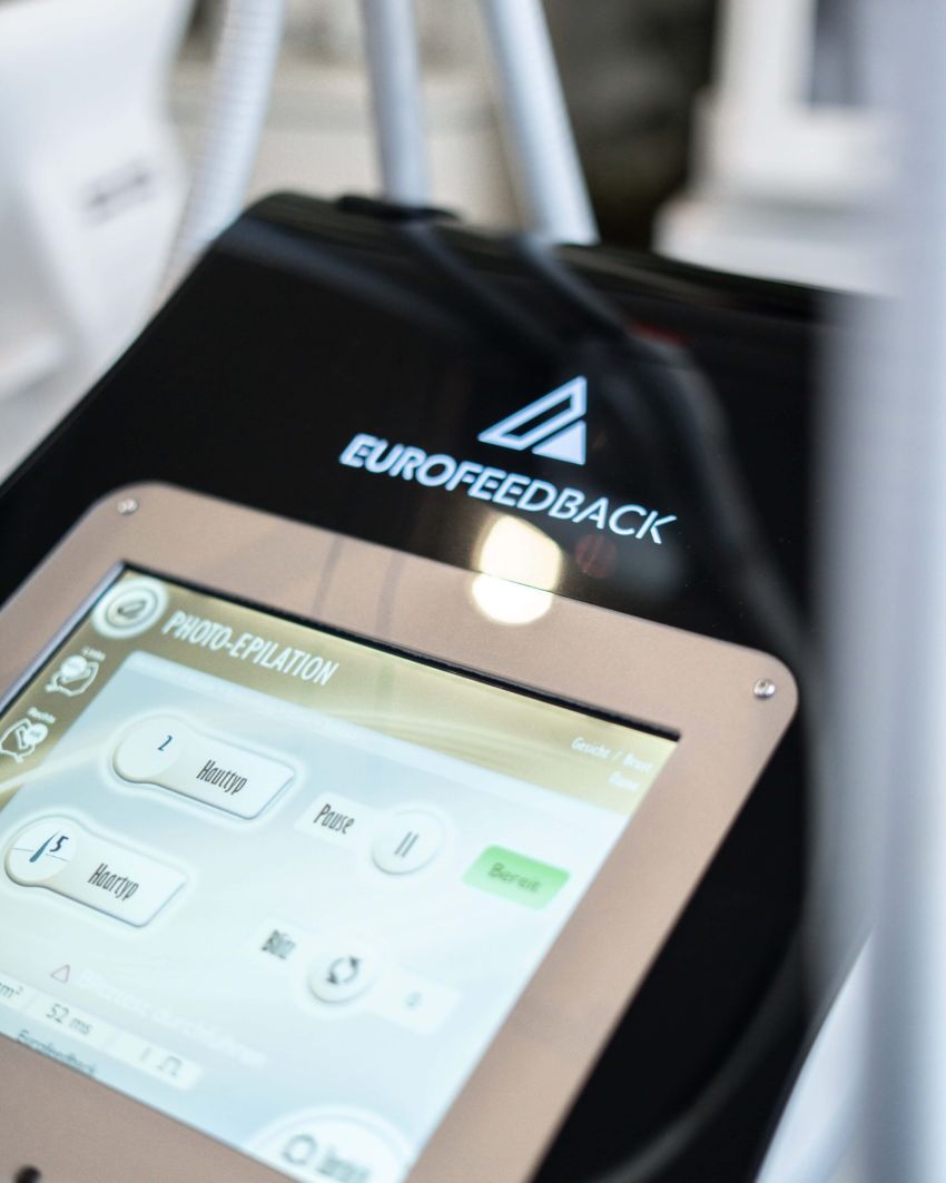 Für die Haarentfernung in unserem Studio nutzen wir das modernste IPL-Gerät Ariane®, das vom französischen Hersteller Eurofeedback entwickelt wurde und sieben Weltpatente besitzt. Drei verschiedene Aufsätze ermöglichen eine individuelle Behandlung. So ist es jetzt auch möglich, sehr helles bzw. weißes Haar dauerhaft zu entfernen. Die Aufsätze geben gezielt warme Lichtimpulse ab, die durch den Farbstoff im Haar wie ein Fahrstuhl gezielt zu den Haarwurzeln geleitet werden. Die Lichtimpulse bzw. die Wärme wirkt direkt an den Wurzeln und verödet diese unmittelbar, sodass das Nachwachsen neuer Haare langfristig verhindert wird.