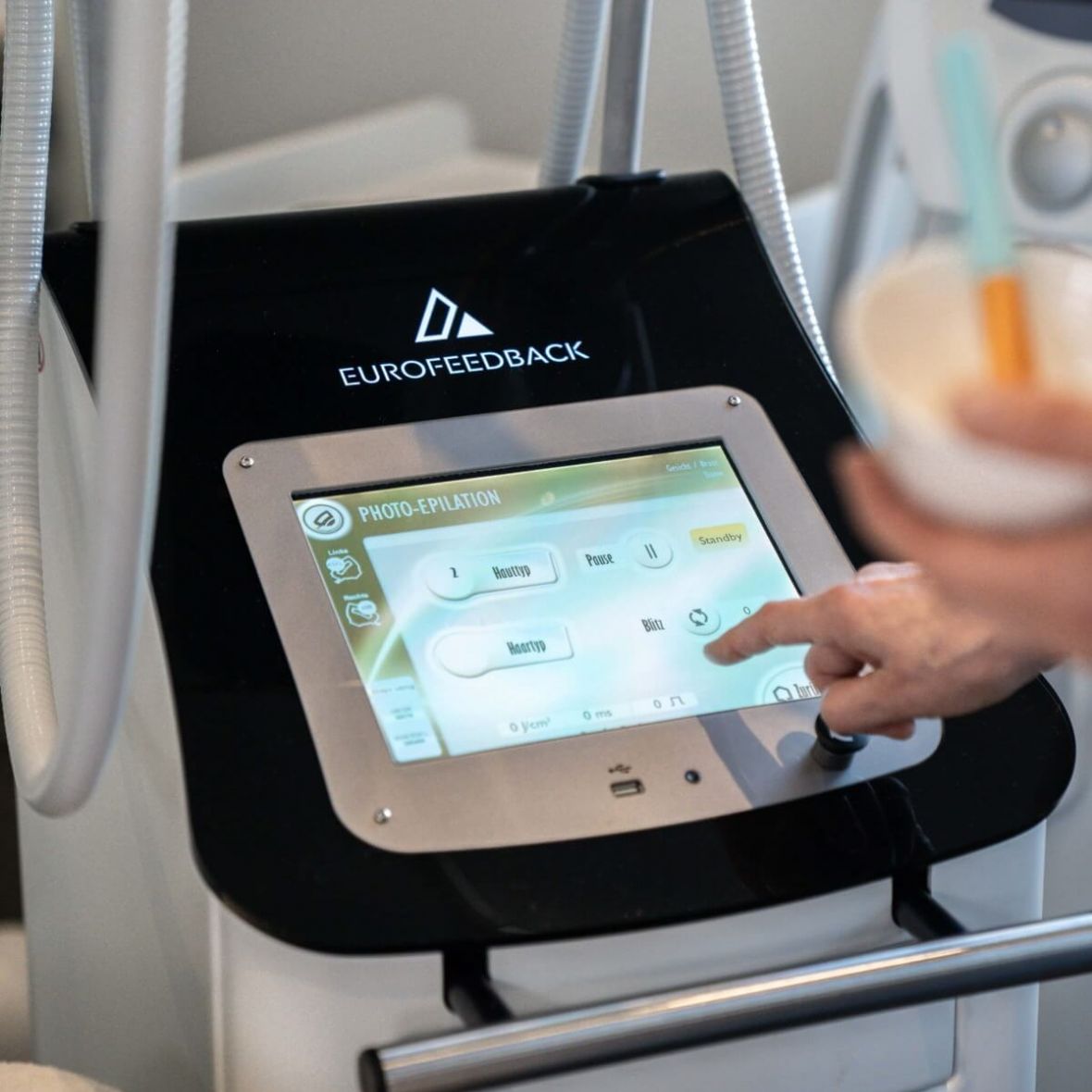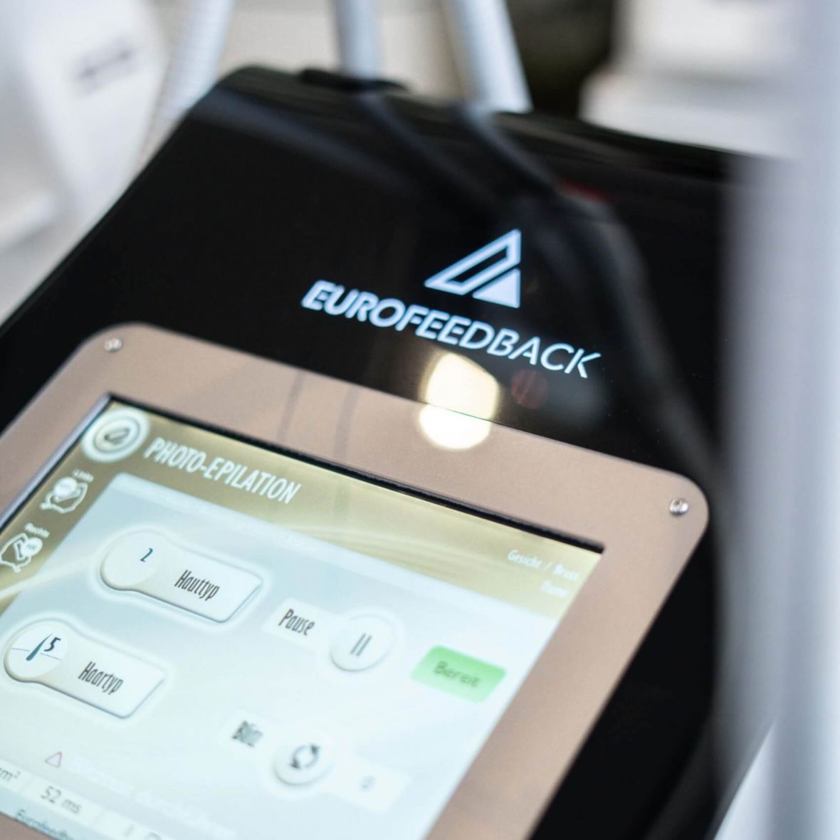 Für die Haarentfernung in unserem Studio nutzen wir das modernste IPL-Gerät Ariane®, das vom französischen Hersteller Eurofeedback entwickelt wurde und sieben Weltpatente besitzt. Drei verschiedene Aufsätze ermöglichen eine individuelle Behandlung. So ist es jetzt auch möglich, sehr helles bzw. weißes Haar dauerhaft zu entfernen. Die Aufsätze geben gezielt warme Lichtimpulse ab, die durch den Farbstoff im Haar wie ein Fahrstuhl gezielt zu den Haarwurzeln geleitet werden. Die Lichtimpulse bzw. die Wärme wirkt direkt an den Wurzeln und verödet diese unmittelbar, sodass das Nachwachsen neuer Haare langfristig verhindert wird.